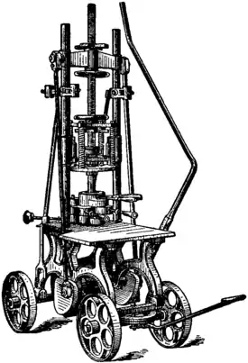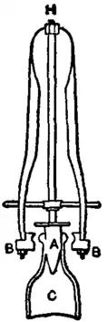 The Venetian furnaces in the island of Murano are small low structures heated with wood. The heat passes from the melting furnace into the annealing kiln. In Germany, Austria and the United States, gas furnaces are generally used. In England directly-heated coal furnaces are still in common use, which in many cases are stoked by mechanical feeders. There are two systems of annealing. The manufactured goods are either removed gradually from a constant source of heat by means of a train of small iron trucks drawn along a tramway by an endless chain, or are placed in a heated kiln in which the fire is allowed gradually to die out. The second system is especially used for annealing large and heavy objects. The manufacture of table-ware is carried on by small gangs of men and boys. In England each “gang” or “chair” consists of three men and one boy. In works, however, in which most of the goods are moulded, and where less skilled labour is required, the proportion of boy labour is increased. There are generally two shifts of workmen, each shift working six hours, and the work is carried on continuously from Monday morning until Friday morning. Directly work is suspended the glass remaining in the crucibles is ladled into water, drained and dried. It is then mixed with the glass mixture and broken glass (“cullet”), and replaced in the crucibles. The furnaces are driven to a white heat in order to fuse the mixture and expel bubbles of gas and air. Before work begins the temperature is lowered sufficiently to render the glass viscous. In the viscous state a mass of glass can be coiled upon the heated end of an iron rod, and if the rod is hollow can be blown into a hollow bulb. The tools used are extremely primitive—hollow iron blowing-rods, solid rods for holding vessels during manipulation, spring tools, resembling sugar-tongs in shape, with steel or wooden blades for fashioning the viscous glass, callipers, measure-sticks, and a variety of moulds of wood, carbon, cast iron, gun-metal and plaster of Paris (figs. 16 and 17). The most important tool, however, is the bench or “chair” on which the workman sits, which serves as his lathe. He sits between two rigid parallel arms, projecting forwards and backwards and sloping slightly from back to front. Across the arms he balances the iron rod to which the glass bulb adheres, and rolling it backwards and forwards with the fingers of his left hand fashions the glass between the blades of his sugar-tongs tool, grasped in his right hand. The hollow bulb is worked into the shape it is intended to assume, partly by blowing, partly by gravitation, and partly by the workman’s tool. If the blowing iron is held vertically with the bulb uppermost the bulb becomes flattened and shallow, if the bulb is allowed to hang downwards it becomes elongated and reduced in diameter, and if the end of the bulb is pierced and the iron is held horizontally and sharply trundled, as a mop is trundled, the bulb opens out into a flattened disk.