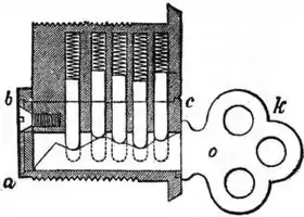 A lock operating on exactly the same principle but entirely different in construction (fig. 9) was invented by Joseph Bramah in 1784. It consists of an outer barrel aaaa, within which is a revolving barrel, cccc, held in place by a steel disk, dd, and provided with a pin b fixed eccentrically for operating the bolt; the barrel is prevented from turning by sheet metal sliders ss, which slide axially in radial grooves in the barrel and project into slots cut into the steel disk which is fastened to the case of the lock. Each slider has a gating cut in its outer edge sufficiently deep to allow it to embrace the inwardly projecting steel plate and turn on it with the barrel. The key is of tubular form having slots cut in its end, each of a depth corresponding to the position of the gating in one of the sliders; so that, on inserting the key, each slider is pushed in—against a spring—exactly far enough to bring its slot opposite the steel disk; in this position the barrel carrying the sliders is turned by the key and actuates the bolt.