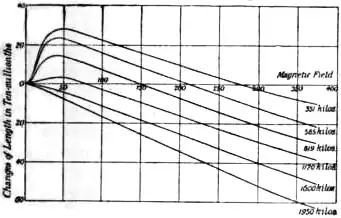- ↑ Principal publications: J. P. Joule, Scientific Papers, pp. 46, 235; A. M. Meyer, Phil. Mag., 1873, 46, 177; W. F. Barrett, Nature, 1882, 26, 585; S. Bidwell, Phil. Trans., 1888, 179A, 205; Proc. Roy. Soc., 1886, 40, 109 and 257; 1888, 43, 406; 1890, 47, 469; 1892, 51, 495; 1894, 55, 228; 1894, 56, 94; 1904, 74, 60; Nature, 1899, 60, 222; M. Cantone, Mem. d. Acc d. Lincei, 1889, 6, 487; Rend. d. Acc. d. Lincei, 1890, 6, 252; A. Berget, C.R., 1892, 115, 722; S. J. Lochner, Phil. Mag., 1893, 36, 498; H. Nagaoka, Phil. Mag., 1894, 37, 131; Wied. Ann., 1894, 53, 487; C. G. Knott, Proc. Roy. Soc. Ed., 1891, 18, 315; Phil. Mag., 1894, 37, 141; Trans. Roy. Soc. Ed., 1896, 38, 527; 1898, 39, 457; C. G. Knott and A. Shand, Proc. Roy. Soc. Ed., 1892, 19, 85 and 249; 1894, 20, 295; L. T. More, Phil. Mag., 1895, 40, 345; G. Klingenberg, Rostock Univ. Thesis, Berlin, 1897; E. T. Jones, Phil. Trans., 1897, 189A, 189; B. B. Brackett, Phys. Rev., 1897, 5, 257; H. Nagaoka and K. Honda, Phil. Mag., 1898, 46, 261; 1900, 49, 329; Journ. Coll. Sci. Tokyo, 1900, 13, 57; 1903, 19, art. 11; J. S. Stevens, Phys. Rev., 1898, 7, 19; E. Rhoads, Phys. Rev., 1898, 7, 5; Phil. Mag., 1901, 2, 463; G. A. Shakespear, Phil. Mag., 1899, 17, 539; K. Honda, Journ. Coll. Sci. Tokyo, 1900, 13, 77; L. W. Austin, Phys. Rev., 1900, 10, 180; Deutsch. Phys. Gesell. Verh., 1904, 6, 4, 211; K. Honda and S. Shimizu, Phil. Mag., 1902, 4, 338; 1905, 10, 548.