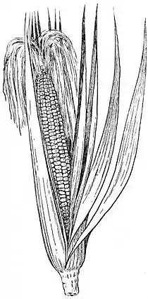 The plant is monoecious, producing the staminate (male) flowers in a large feathery panicle at the summit, and the (female) dense spikes of flowers, or “cobs,” in the axils of the leaves below, the long pink styles hanging out like a silken tassel. They are invested by the sheaths of leaves, much used in packing oranges in south Europe, and the more delicate ones for cigarettes in South America. Fig. 2 shows a branch of the terminal male inflorescence. Fig. 3 is a single spikelet of the same, containing two florets, with the three stamens of one only protruded. Fig. 4 is a spike of the female inflorescence, protected by the sheaths of leaves—the blades being also present. Usually the sheaths terminate in a point, the blades being arrested. Fig. 5 is a spikelet of the female inflorescence, consisting of two outer glumes, the lower one ciliated, which enclose two florets—one (a) barren (sometimes fertile), consisting of a flowering glume and pale only, and the other (b) fertile, containing the pistil with elongated style. The mass of styles from the whole spike is pendulous from the summit of the sheaths, as in fig. 4. Fig. 6 shows the fruit or grain. More than three hundred varieties are known, which differ more among themselves than those of any other cereal. Some come to maturity in two months, others require seven months; some are as many feet high as others are inches; some have kernels eleven times larger than others. They vary similarly in shape and size of ears, colour of the grain, which may be white, yellow, purple, striped, &c., and also in physical characters and chemical composition. Dr E. Lewis Sturtevant, who has made an extended study of the forms and varieties, classes into seven groups those grown primarily for the grain, the distinguishing characters of which are based on the grains or kernels; there are, in addition, forms of horticultural interest grown for ornament. Pod corn (var. tunicata) is characterized by having each kernel enclosed in a husk. Pop corn (var. everta) has a very large proportion of the “endosperm”—the nutritious matter which with the small embryo makes up the grain—of a horny consistency, which causes the grain to pop when heated, that is to say, the kernel becomes turned inside out by the explosion of the contained moisture. It is also characterized by the small size of the grain and ear. Flint corn (var. indurata) has a starchy endosperm enclosed in a horny layer of varying thickness in the different varieties. The colour of the grain is white, yellow, red, blue or variegated. It is commonly cultivated in Canada and northern United States, where the seasons are too short for Dent corn, and has been grown as far north as 50° N. lat. Dent or field corn (var. indentata) has the starchy endosperm extending to the summit of the grain, with horny endosperm at the sides. The top of the grain becomes indented, owing to the drying and shrinkage of the starchy matter; the character of the indented surface varies with the height and thickness of the horny endosperm. This is the form commonly grown in the United States; the varieties differ widely in the size of the plants and the appearance of the ear.