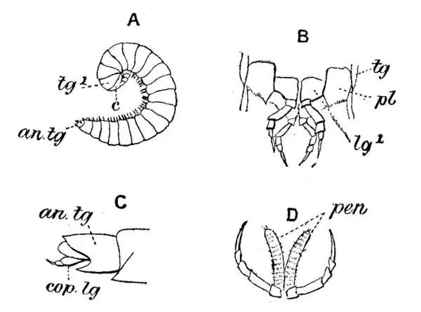 A, Lateral view. c, head with antennae; tgl, tergal plate of first segment; an.tg, tergal plate of last or anal segment. B, Lower view of one of the segments. tg, inferior edge of the tergal plate; pl, pleural sclerite; lgl, basal segment of leg. C, Posterior extremity of body. an.tg, tergal plate of anal segment; cop.lg. gonopod or copulatory leg. D, Legs of the third pair with extruded penes, pen, in front of them.