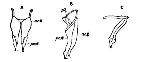 - B, Gonopods of the male. gp1 and gp2, anterior and posterior pairs of gonopods, both being chelate claspers; pen, processes arising from the basal segments of the gonopods of the second pair, which act as penes.