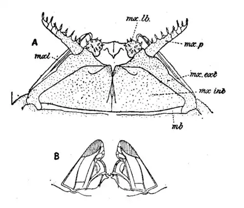 | C. Jaws of third and fourth pairs; mx, maxilla; p.mx, maxillary palp; lb.mx, maxillary lobes; lb.st, sternal plate of jaw of fourth pair or labium; lb1, lb2, first and second segments of labium. (Figs. A, B, C modified from Hansen, Q.J.M.S., 47. pl. I.) | |