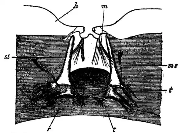 | A. Mandibles or jaws of first pair of Scolopendrella; md1, and md2, first and second segments; t, tendon; c, part of ventral skeleton of head. | |