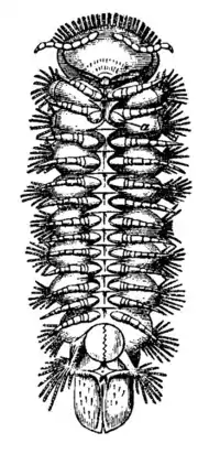 Prosogoneate Arthropods, differing in many important particulars from the Diplopoda and Pauropoda. The axis of the head lies in the same straight line as that of the body, as in the Chilopoda, and not at right angles to it as in the Diplopoda and Pauropoda. There are no eyes. The antennae are very long and many-jointed. Four pairs of gnathites attached to the under-side of the head have been detected. The first pair (mandibles) are two-jointed, as in many Diplopods. The second pair (maxillulae) are minute, one jointed and articulated to a median lobe or hypo pharynx which is supported by two chitinous skeletal rods. The third pair (maxillae) consist of a long, basal segment terminating distally in two lobes; near the distal end of the basal segments there is externally a minute one- or two-jointed process, regarded as a palpus. Between the maxillae lies a large, double plate (labium or maxillae of second pair) which is attached proximally to two rod-like basal segments and terminates distally in two pairs of short lobes. The body is long and narrow and bears on its dorsal side fifteen tergal plates. The first of these, immediately succeeding the head, is very short; the remainder are large and sub-equal in size. The adult animal is furnished with twelve pairs of walking legs, which, with the exception of the first pair, are alike in size and segmentation. Each consists of five segments, the distal of which is long and terminates with two powerful claws. The proximal segment bears internally a slender, cylindrical process which may be termed the parapod. It has been asserted that the segment bearing this parapod is in reality the second and that the true basal segment or coxa is embedded in the ventral integument. The legs of the first and second pairs never have the parapod, but they are invariably present in the remaining ten pairs. The legs of the first pair are never more than four-jointed; they are always smaller than the others, and are sometimes reduced to mere bud-like processes. They belong to the first segment behind the head. The segment represented by the last tergal plate has no ambulatory limbs; but articulated to its posterior border is a pair of large, backwardly directed sclerites, which are perforated by the ducts of two spinning glands. These segments are regarded by some authors as the appendages of the last segment, and have been compared to the cercopods of insects. Attached also to the sides of the last segment-in front of the spinning mamilla there is a sub-conical papilla bearing an apical seta arising from a cuplike depression. It has been suggested that these papillae also represent a pair of appendages. In that case the last segment must be double and bear two pairs of appendages. Thus there may be as many as fourteen pairs of trunk appendages. There are, however, only twelve pairs known to exist with certainty. These are represented by as many segments on the ventral side; but are numerically less by two than the terga. It is not known whether this very unusual phenomenon is to be accounted for by the addition of two supernumerary terga or by the escalation of two pairs of appendages. The legs of the first pair are basally in contact; the rest are separated by a triangular sternal area. At the base of the legs, with the exception of those of the first and last pair, there, is a slit-like orifice recalling the coxal sacs of certain Diplopoda (e.g. Lysiopetalum, Platydesmus). In internal anatomy the Symphyla closely resemble the Diplopoda. The alimentary canal is straight and simple, with a pair of "salivary" glands opening into the fore-gut, and a pair of malpighian tubes joining the hind-gut close to its communication with the mid-gut. There is a dorsal heart with segmental ostia and valves, and also a supra neural vessel. The silk glands, which occur in both sexes, are situated as in Lysiopetalum. The generative glands and ducts, which are paired, lie between the alimentary canal above and the normally constructed nerve-cord below, and are accompanied in the male by a pair of seminal vesicles; and the orifice lies ventrally in the third segment behind the head. A peculiarity in which the Symphyla differ from all "tracheate" arthropoda is the presence of a single pair of tracheal tubes opening by a pair of spiracles on the lower surface of the head behind the antennae.