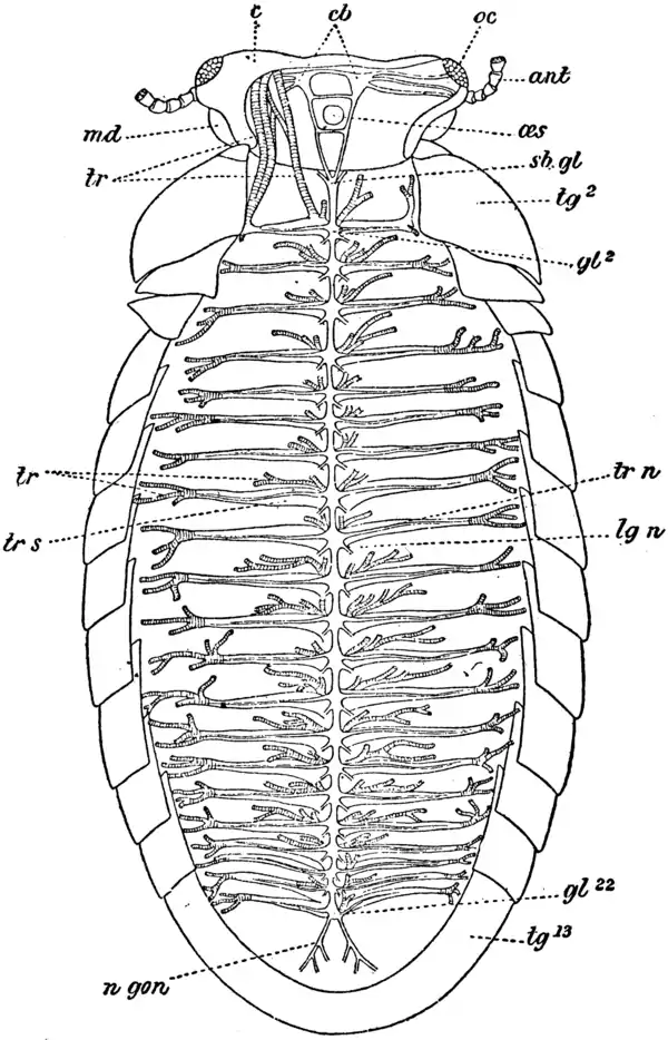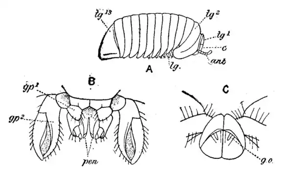 - A, Lateral view of the entire animal. c, head; ant, antenna; tgl1, tg2 and tg13, tergal plates of first, second and thirteenth segments; lg, extremities of some of the anterior legs.