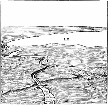 The problem of the river’s age is of much interest to geologists, because its solution would aid in establishing a relation between the periods and ages of geologic time and the centuries of human chronology. The great Canadian glacier, which in the Glacial period alternately crowded forward over the Great Lakes region and melted back again, so modified the face of the land by erosion and by the deposit of drift that the waters afterwards had to find new courses. The Niagara river came into existence when the waning of the glacier laid bare the western part of the Ontario basin, and the making of the gorge was then begun. If it were supposable that the lengthening of the gorge proceeded at a uniform rate, the computation of the time would be easy, but there are various modifying conditions. (1) The limestone is not equally thick all along the gorge; in one place it is 90 ft., and in several places as little as 35 ft. (2) The height of the cataract has varied from 155 ft. to more than 300 ft. (3) For a short distance at the whirlpool the limestone and shale were replaced by softer material, sand and clay. The river here touched a more ancient gorge, which had previously been concealed by drift except at the escarpment. The diagram shows the breach in the escarpment at St Davids directed towards the sharp turn of the river gorge at the whirlpool. (4) The size of the river has varied. While the glacier was gradually melting the lakes underwent a complicated series of metamorphoses, and there were two separate epochs when the discharge from all the basins beyond Lake Erie followed other routes, and during these epochs the Niagara drained only one-eighth of its present territory. The variation in the size of the river is the most important of the modifying conditions, and at the same time least amenable to computation.