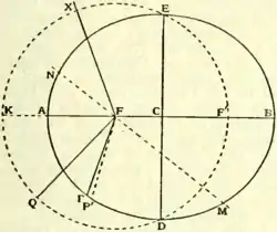 Let the curve represent an elliptic orbit, AB being the major axis, DE the minor axis, and F the focus in which the centre of attraction is situated, which centre we shall call the sun. From the
