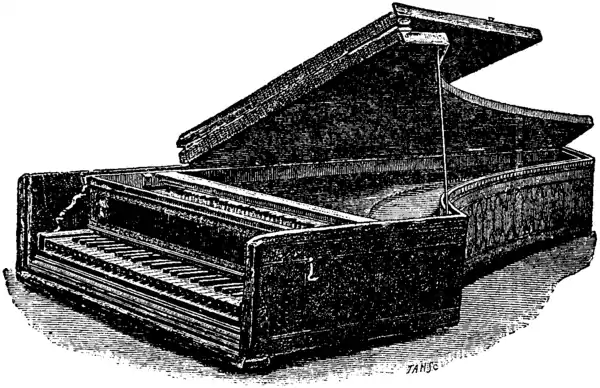The earliest known record of the clavichord occurs in some rules of the minnesingers,[8] dated 1404, preserved at Vienna. The monochord is named with it, showing a differentiation of these instruments, and of them from the clavicymbalum, the keyed cymbal, cembalo (Italian), or psaltery. From this we learn that a keyboard had been thus early adapted to that favourite medieval stringed instrument, the “cembalo” of Boccaccio, the “sautrie” of Chaucer. There were two forms of the psaltery: (1) the trapeze, one of the oldest representations of which is to be found in Orcagna’s famous Trionfo della Morte in the Campo Santo at Pisa, and another by the same painter in the National Gallery, London; and (2) the contemporary “testa di porco,” the pig’s head, which was of triangular shape as the name suggests. The trapeze psaltery was strung horizontally, the “istromento di porco” either horizontally or vertically—the notes, as in the common dulcimer, being in groups of three or four unisons. In these differences of form and stringing we see the cause of the ultimate differentiation of the spinet and harpsichord. The compass of the psalteries was nearly that of Guido’s scale; but according to Mersenne,[9] the lowest interval was a fourth, G to C, which is worthy of notice as anticipating the later “short measure”[10] of the spinet and organ.