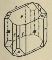 REALGAR, a mineral species consisting of arsenic mono sulphide (AsS) and occurring as mono clinic crystals of a bright red colour. There is a perfect cleavage parallel to the plane of symmetry (r in fig.). The lustre is resinous, and the streak has the same colour as the crystals, namely, orange-red to aurora-red. The hardness is 1½–2 and the specific gravity 3·55. On exposure to light the crystals crumble to a yellow powder. The name realgar is of Arabic origin, and was used by the alchemists; the substance was known to Theophrastus under the name Σανδαράκη, and to Pliny as Sandaracha.