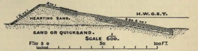 There are many examples of sea-coast reclamation: Romney marsh was enclosed long ago by the Dymchurch wall (see fig. 1), and a large portion of Holland has been reclaimed from the sea by embankments (see fig. 2); the reclamation bank for the Hodbarrow iron mines (see fig. 3) illustrates the use of puddled clay to prevent infiltration.