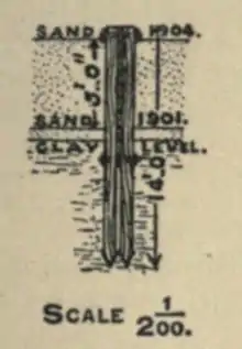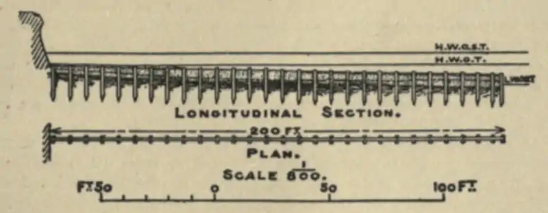 Accordingly, groynes (see figs. 11, 12) made of 14 ft. × 9 in. × 9 in. pitch-pine piles, and 11 in. × 4 in. planking, were erected along the foreshore. The piles originally projected about 6 ft.; but, to prevent heaping up of sand to windward with denudation to leeward, the planking was never raised more than two strakes above sand-level, fresh planks being added as the sand rose. The south-easterly gales are said to be the most erosive here, and prevalent during the Winter months; on this account the groynes were given an inclination of 10° south of east, that is 10° from the perpendicular. It may be doubted whether this was the best angle, but the result has been very satisfactory. The cost of construction was from 125. 3d. to I8S. per lineal foot.