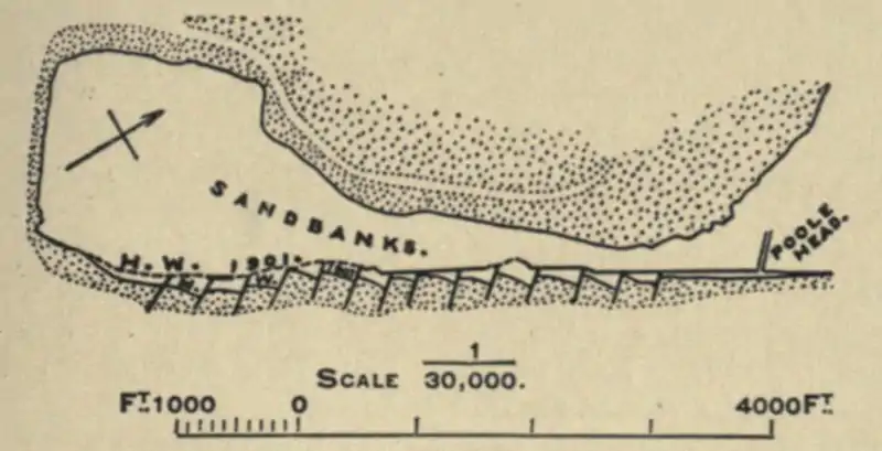 The sand-banks at the entrance to Poole Harbour have been protected by groynes (see fig. 13) inclined at slightly varying angles, some yielding better results than others. This is a good example of the important work which may be accomplished by groyning. Unprotected, a breach would soon have been effected in these sand-banks; with a double entrance to the bay the present deep channel would have silted up, and Poole Harbour would have been practically destroyed.