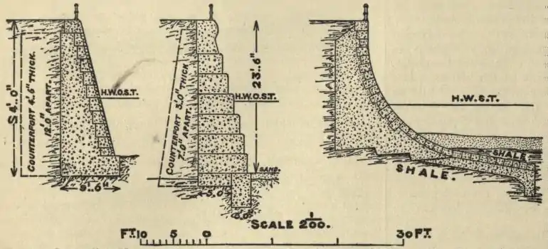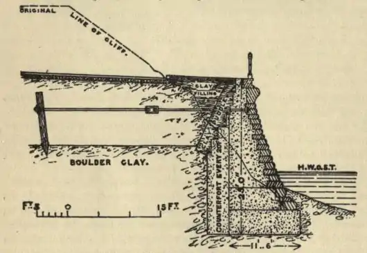 The Beaconsfield sea-wall at Bridlington (see fig. 7) is stepped and slightly curved; it has a stone face with concrete backing, strengthened at intervals by counter forts. The thickness of the wall varies from 11 ft. 6 in. at the base to 3 ft. at the top, and is surmounted by a dressed cornice and coping; the length is 340 yards. The work was constructed, in 1888, at a cost of £10,000, or £29, 8s. per lineal yard.