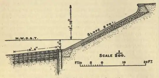Parts of the sea bank at Ostend (see fig. 8) have been carried out beyond high-water mark to gain a strip of land for the esplanade; and these portions have had to be protected from undermining at the toe with piles and planks, and an apron of concrete or pitching, laid on fascines, extending down the foreshore. For the parts above high-water mark a short paved slope, with moderate protection at the toe, has been found sufficient. The top face of these slopes is reflexed so as to protect the esplanade from surf during storms. Sea-Walls are very costly and, while temporarily resisting, do not diminish but actually increase, the erosive action of the sea. In short, sea-walls are a most unsatisfactory type of protective work.