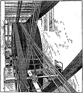 Fig. 6.—Rope Race of a Lancashire Cotton-Spinning Mill, with 38 Lambeth Cotton Driving Ropes, 13⁄4 in. diameter; engine, 1700 H.P. Fig. 6 shows the application of these ropes, which pass direct from the main driving pulley to the different flats of the mill.