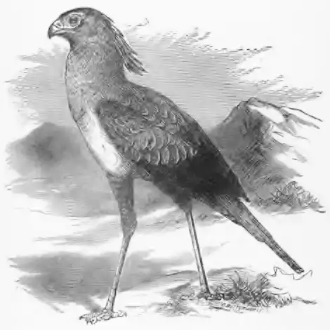SECRETARY-BIRD, a very singular African bird, first accurately made known, from 'an example living in the menagerie of the prince of Orange, in 1769 by A. Vosmaer,[1] in a treatise published simultaneously in Dutch and French, and afterwards included in his collected works issued, under the title of Regnum Animate, in 1804. He was told that at the Cape of Good Hope this bird was known as the “Sagittarius” or Archer, from its striding gait being thought to resemble that of a bowman advancing to shoot, but that this name had been corrupted into that of “Secretarius."