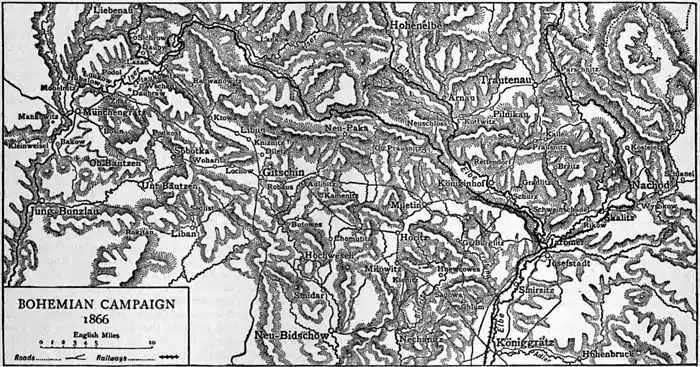 Advance of the Elbe and I. Armies—This was one of the gravest crises in Moltke's career. To overcome it he at length obtained authority (June 15th) to order the army of the Elbe into Saxony, and on the 18th the Prussians entered Dresden, the Saxons retiring along the Elbe into Bohemia; and on the same day the news that the Austrian main body was marching from Olmütz towards Prague arrived at headquarters. Moltke took three days to solve the new problem, then, on the 22nd, he ordered the I. and II. armies to cross the Austrian frontier and unite near Gitschin, a point conveniently situated about the convergence of the roads crossing the Bohemian mountains. As during this operation the II. army would be the most exposed, the to which the army of the Elbe had now been attached, was to push on its advance to the utmost. Apparently with this purpose in view, Prince Frederick Charles was instructed to break up his army corps into their constituent divisions, and move each division as a separate column on its own road, the reserve of cavalry and artillery following in rear of the centre. The consequences were the reverse of those anticipated. On the afternoon of the 26th the advance guards of the I. army and army of the Elbe came in contact with the Austrians at Hühnerwasser and Podol and drove the latter back after a sharp engagement, but, having no cavalry, could neither observe their subsequent proceedings nor estimate their strength. The prince, seeing the opportunity for a battle, immediately issued orders for an enveloping attack on Münchengrätz by his whole army, but, owing to distances and the number of units now requiring direction, it was late in the following day before all were in readiness for action. The Austrians then slipped away, and the whole of the next day was spent in getting the divisions back to their proper lines of advance. Clam-Gallas then retired deliberately to Gitschin and took up a new position. The Prussians followed on the 29th, but, owing to the lie of the roads, they had to march in two long columns, separated by almost a day's march, and when the advanced guard of the left column, late in the afternoon, gained touch with the enemy, the latter were in a position to crush them by weight of numbers, had they not suddenly been ordered to continue the retreat on Miletin.