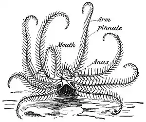 The feather-stars (fig. 4) have a central body and five arms, each forking at least once and fringed with small branches (pinnules) which give the feathery appearance. The mouth is in the middle of the body, and from it grooves pass along the arms and all their branches. The animal lives with the mouth upwards, and although it can crawl and even swim by movement of its arms, it generally fixes itself to a stone or seaweed or some zoophyte, by means of a bunch of small jointed and hooked processes (cirri) growing from the back or under side of the body. It gets its food in this way: the arm-grooves (Echinoderma, fig. 12, C) are lined with minute hairs (cilia) always waving in the direction of the mouth, towards which they drive a stream of water; this stream, containing minute organisms, constantly flows through the coiled gut, which extracts nourishment from it. The feather-stars were formerly placed with the starfish, but they really belong to another class of Echinoderms—the Crinoidea.