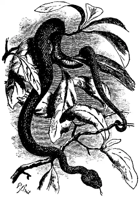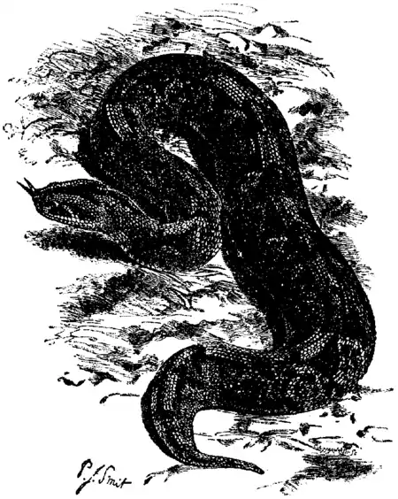 Bitis s. Echidna s. Clotho has two rows of shields on the underside of the very short tail; the thick head is much depressed, like the body. The nasal shields are separated from the rostral by small scales, otherwise much resembling the genus Vipera. B. arietans, the “puff-adder” of nearly the whole of Africa, an ugly, very dangerous brute growing to a length of 4 or 5 ft. B. nasicornis, the West African nose-horned viper, has a pair of erectile scales on the nose. Scarcely smaller and less bulky than the puff-adder and just as poisonous, it is yet very handsomely marked with a series of large pale, dark-edged spots and oblique crosses on a purplish or reddish brown ground. Especially handsome are the young, which at birth are as much as 1 ft. in length. On one occasion one of these snakes, after giving birth to twenty-one young (which bit and killed mice within five minutes of being born), became very ill-tempered, and when two adult males were placed in her cage she bit one with such violence as to break off one of her fangs, which she left, about three-quarters of an inch in length, sticking in his back. He, however, appeared not to suffer the slightest inconvenience, and was never the worse for it (see Proc. Zool. Soc. 1871, p. 638).