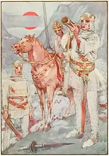 "When only sixty Franks remained, the pride of Roland gave way to pity for the men whom he had led to death, and he took the magic horn Olifant in his hand, that he might blow on it a blast that would bring Charlemagne, his mighty army behind him, to wipe out the Saracen host that had done him such evil. But Oliver bitterly protested. Earlier in the day, when he had willed it, Roland had refused to call for help. Now the day was done. The twilight of death—Death the inevitable—was closing in upon them. Why, then, call now for Charlemagne, when nor he nor any other could help them? But Turpin with all his force backed the wish of Roland.