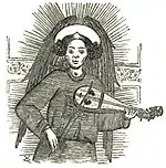 It was shaped like the half of a pear, and was everywhere solid except at the two extremities, the upper of which was formed into a peg-box identical with that still in use, and surmounted by a carved human head. The lower half was considerably cut down in level, thus leaving the upper solid part of the instrument to form a natural fingerboard. The portion thus cut down was scooped out, and over the cavity thus formed was glued a short pine belly, pierced with two trefoil-shaped soundholes, and fitted with a bridge and soundpost. The player either rested the curved end of the instrument lightly against the breast, or else held it like the violin, between the chin and the collar-bone, and bowed it like the violin. It had three stout gut strings, tuned like the lower strings of the violin (A, D, G). Its tone was loud and harsh, emulating the female voice, according to a French poem of the 13th century: