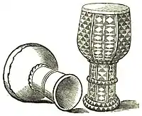 The modern Egyptians have drums (Darabukkeh) with one skin or head, and open at the bottom, which is the only reason for classifying them with tambourines. [See vol. i. p. 463.] The annexed woodcut (also from Lane) shows two examples; the first of wood, inlaid with shell and mother-of-pearl, 17 inches high and 6½ diameter at top; the second is of earthenware, 10½ inches high and 8¼ diameter. [ V. de P. ]
