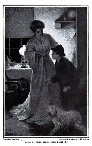 By the time he had regained his feet he was blinded with a flood of light from the suddenly opened door. Before him in the glare was not the expected figure of his father, but a woman dressed in flowing white—a woman who was saying, "Come in quick, child, come right in." And her hands drew him so quickly inside that Caper gained the shelter of the room only by a wild dash. The next thing the boy knew his coat and shirt had been stripped from him, and the woman was deftly rubbing his drenched and shivering body into a warm glow and saying: