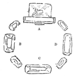 Almost all round the ruined town there are numberless limestone hills between fifty and three hundred feet in height, and at the top of nearly every one of them are foundation-mounds or tumuli. In some cases these foundations are merely outlined in rough stones, in others they are flat oblong mounds, which may have supported buildings of a perishable material. A common arrangement of the remains on these hilltops is given in the accompanying sketch. I opened one set thus arranged. The monnd A had probably supported a small "cue" or shrine; a terrace ran in front of it, which was reached by a short flight of