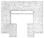I made an excavation on the summit of the mound marked X in the plan, that disclosed the remains of a house or temple, of which a ground-plan is given. Only two walls could be found, but there was almost certainly an outer chamber, which is shown in dotted lines. Near the middle doorway a rough unworked slab of stone was lying, which had probably served as a lintel. The doorway in the back wall had been blocked up after the house was built. The walls still standing are about five feet high, and, from the position of the stone lintel above the blocked-up doorway, I should estimate the original height of the walls at a little over six feet. The cement floor of the house is still in fair condition, and there are traces of a cement-covered platform which ran round the outside of it. Some fragments of rough pottery were found inside the house. No roofing-stones of the type used in Copan, Tikál, and the other great ruins could be found, and I am inclined to think that the very narrow chambers were roofed with flat slabs, and some slabs which would have answered the purpose were found among the debris. There are several carved monoliths which formerly stood on the level ground in front of the buildings, but most of them are overturned and partly destroyed. The only one in a fair state of preservation is shown in the accompanying Plate; but this is one of great importance, and we made a careful mould of it, from which a plaster-cast has been made; this is now in the South Kensington Museum.