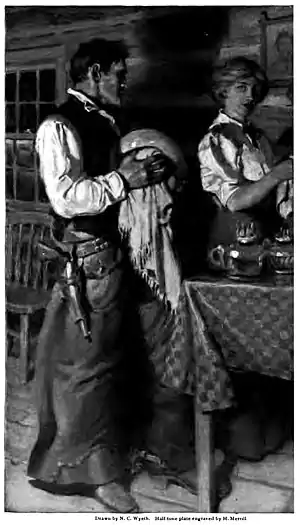 The girl, sitting in the kitchen and hearing the swift and vigorous movement within, experienced a revulsion to the awe and terror of the midnight. For the second time in her life death had come very close to her, but in this case her terror was shot through with the ruddy sympathy of a handsome, picturesque young cavalier. She could not be really angry with him, though she was genuinely shocked by his reckless disregard of the proprieties; for he came at such a dark and lonely and helpless hour, and his prompt and fearless action in silencing those dreadful cow-boys was heroic. Therefore, when the doctor sent Roy out to say that her uncle would live, a part of her relief and joy shone upon the young rancher, who was correspondingly exalted.