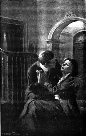 She passed her arms around my neck and pressed her wet cheek to mine; then she kissed me, and, turning away abruptly, walked across to the door and opened it. On the landing, in the light of the lamp, she turned once more; and I saw that the hot blush that had risen to her cheek as she kissed me, had faded already into a deathly pallor, and that the dreadful, frightened, hunted look had come back into her face. She stood for a moment with her finger raised warningly and whispered: