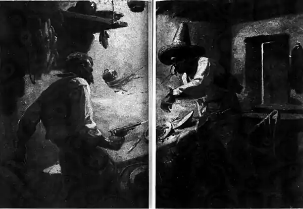 While the man from the kitchen fled to spread the news, the Texan crouched behind the table awaiting the coming of the other outlaws.