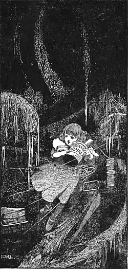 Either the well was very deep, or she fell very slowly, for she had plenty of time as she went down to look about her, and to wonder what was going to happen next. First, she tried to look down and make out what she was coming to, but it was too dark to see anything; then she looked at the sides of the well, and noticed that they were filled with cupboards and book-shelves: here and there she saw maps and pictures hung upon pegs. She took down a jar from one of the shelves as she passed; it was labelled “ORANGE MARMALADE,” but to her great disappointment it was empty: she did not like to drop the jar for fear of killing somebody underneath, so managed to put it into one of the cupboards as she fell past it.