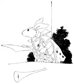 The long grass rustled at her feet as the White Rabbit hurried by—the frightened Mouse splashed his way through the neighbouring pool—she could hear the rattle of the teacups as the March Hare and his friends shared their never-ending meal, and the shrill voice of the Queen ordering off her unfortunate guests to execution—once more the pig-baby was sneezing on the Duchess's knee, while plates and dishes crashed around it—once more the shriek of the Gryphon, the squeaking of the Lizard's slate-pencil, and the choking of the suppressed guinea-pigs, filled the air, mixed up with the distant sobs of the miserable Mock Turtle.