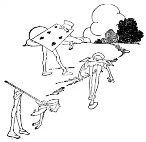 First came ten soldiers carrying clubs; these were all shaped like the three gardeners, oblong and flat, with their hands and feet at the corners: next the ten courtiers; these were ornamented all over with diamonds, and walked two and two, as the soldiers did. After these came the royal children; there were ten of them, and the little dears came jumping merrily along hand in hand, in couples; they were all ornamented with hearts. Next came the guests, mostly Kings and Queens, and among them Alice recognised the White Rabbit: it was talking in a hurried, nervous manner, smiling at everything that was said, and went by without noticing her. Then followed the Knave of Hearts, carrying the King's crown on a crimson velvet cushion; and, last of all this grand procession, came THE KING AND QUEEN OF HEARTS.