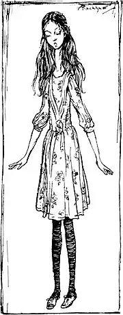 As she said this she looked down at her hands, and was surprised to see that she had put on one of the Rabbit’s little white kid gloves while she was talking. “How can I have done that?” she thought. “I must be growing small again.” She got up and went to the table to measure herself by it, and found that, as nearly as she could guess, she was now about two feet high, and was going on shrinking rapidly: she soon found out that the cause of this was the fan she was holding, and she dropped it hastily, just in time to avoid shrinking away altogether.