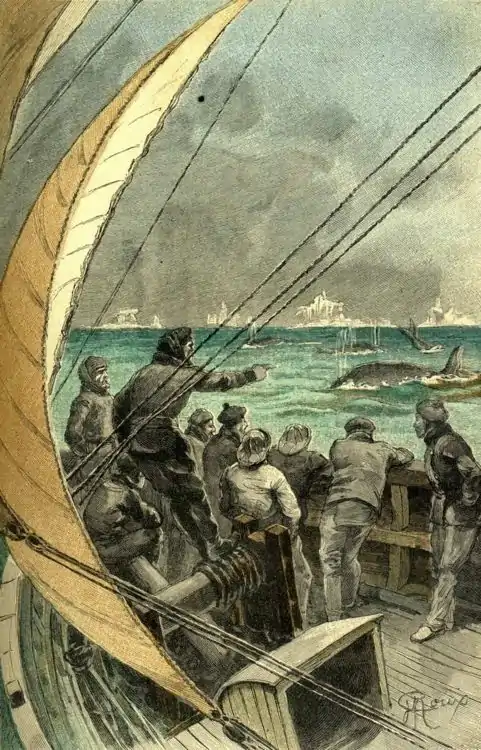 One day, about three o'clock in the afternoon, I had gone forward to watch the gambols of a "school" of the huge sea mammals. Hearne was pointing them out to his companions, and muttering in disjointed phrases,—