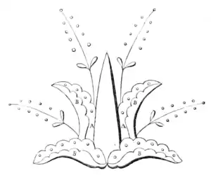 A. the foundation merely shaped. B. the same edged with galoon. C. the same embroidered. D. the band upon which the gold tambour (passe) is worked. a. pink. b. yellow. or any other suitable stuff, most commonly the former, was then shaped in a similar way, the edges being bound (galonner) with cord, which was afterwards cast over (en guipure) with gold or silver tambour. The inner part of the design was then worked, either plain or in shades, in tapestry stitch with silk; this too was sometimes raised above the foundation by felt (embouttin). If a leaf were to be represented, (passe en barbiches,) the fibres were expressed by a fine thread of tambour being lightly passed among the silk, to indicate the vegetable tissue. In fact, neither gold nor silver could ever be inappropriately, or too profusely introduced, in delineating the object.