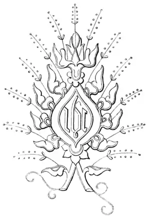 There were two ways of introducing the gold or silver portion. A very common method was to take a piece of gold lace, and cutting it out in the required shape, to attach it to the foundation, and the surface of this (le passé épargne) was raised (embouttin) in certain lines (as, for instance, in representing the sacred monogram) by cord or common twine, which in its turn was whipped over (guipé) but completely covered with a thread of the same metal. The other mode (en couchure) was the most ancient of embroideries; it was made with coarse gold thread or spangles, sewn in rows one beside another.