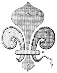 The materials that may be legitimately used to produce English embroidery like that already described, are limited to five: namely, gold and silver tambour (passé), jewels, velvet, and silk[18]. Having chosen the substance that was to be wrought, the first point was to make out the pattern (prendre la taille) of the conventional device that was to be powdered on the surface. This might be done by tracing it by means of chalk upon white paper, and piercing that so as to shew its contour; several others could then be cut out to the same size and figures. The foundation (le fond) of canvass, vellum,