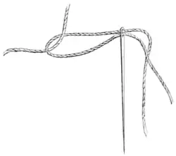 Manner in which the end of the silk is taken in the eye of the needle to the ends, when it is wished to draw it under the stuff.