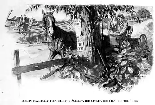 They were bowling down a steep hill leading to a village below, and a group of children were also riding down the hill in home-made coasters on wheels. The steepness of the hill and the hazard of the children kept Mortimer so fully occupied in restraining the homicidal possibilities of The Hornet that again he was obliged to leave his remark unfinished. But when he approached the foot of the hill and saw a livery-stable sign creaking gently in the breeze, an inspiration grand and noble dashed quickly through his comprehending mind.