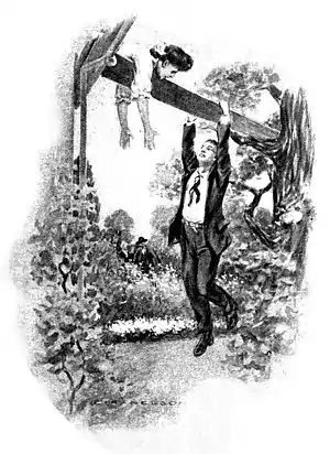 She sprang up the steps, through the boy's room and into the hallway. There she quickly perceived the ladder, and mounted it to the roof. Taking in the situation at a glance she ran with steady steps down the sloping roof to where the plank lay, and stepped out upon it far enough to see the boy dangling beside her. Then she decided instantly what to do.