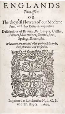- England's Parnassus; or the choycest Flowers of our Modern Poets, with their Poeticall comparisons, Descriptions of Bewties, Personages, Castles, Pallaces, Mountaines, Groves, Seas, Springs, Rivers, &c. Whereunto are annexed other various discourses, both pleasant and profitable (1600) (external scan)