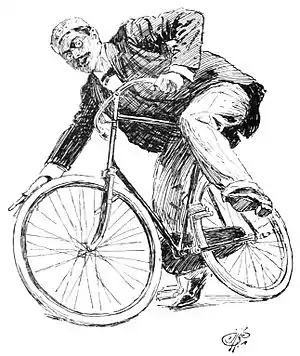 But, on receiving the bicycle from his hands, I at once perceived myself under a total impossibility of achieving its ascent—for no sooner had I protruded one leg over the saddle than the foremost wheel averted itself, and the entire machine bit the dust, which afforded lively and infinite entertainment to my feminine companions.