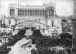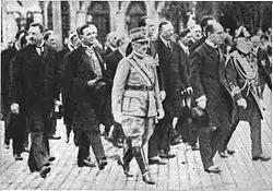 Premier Mussolini is at the right, followed by General Diaz, Admiral de Reval, and other officials, as they proceeded to the tomb of the "Unknown Hero," where allegiance to the King was sworn by the new government