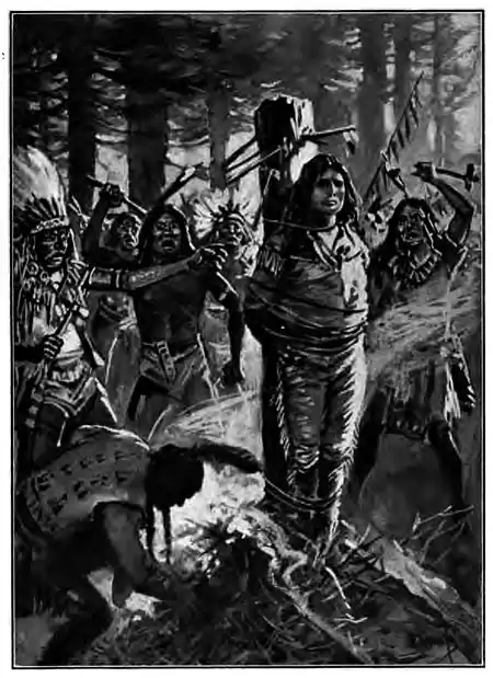 The maidens had long since desisted in their efforts to torment the prisoner. Even the hardened old squaws had withdrawn. The prisoner's proud, handsome face, his upright bearing, his scorn for his enemies, his indifference to the cuts and bruises, and red welts upon his clear white skin had won their hearts.