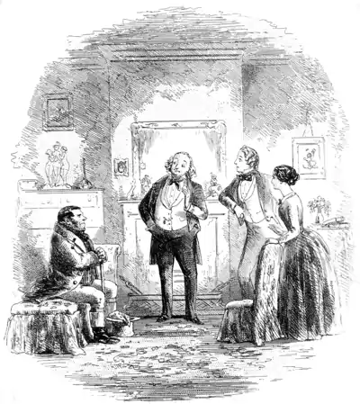 I was apprehensive that his illness might be of a dangerous kind ; but of course, I begged her to be quiet and not disturb any one ; and collected myself, as I followed her quickly upstairs, sufficiently to consider what were the best remedies to be applied if it should prove to be a fit. She threw open a door, and I went into a chamber ; where, to my unspeakable surprise, instead of finding Mr. Skimpole stretched upon the bed, or prostrate on the floor, I found him standing before the fire smiling at Richard, while Richard, with a face of great embarrassment, looked at a person on a sofa, in a white great coat, with smooth hair upon his head and not much of it, which he was wiping smoother, and making less of, with a pocket-handkerchief.