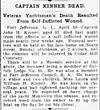 Captain Kinner Dead. Veteran Yachtsman's Death Resulted From Self-Inflicted Wound. Port Jefferson, New York; April 10, 1903. Captain John H. Kinner, aged 87, died last night from the effect of a self inflicted wound made nearly four weeks ago. Funeral services will be held at his late home on South street. Monday afternoon, at 2 o'clock, and the remains will be interred in Cedar Hill Cemetery. There will be a Masonic service at the grave, the deceased being a member of Suffolk Lodge No. 60. He was also a member of Port Jefferson Council, R. A. He leaves a widow and two children. Miss Laura and William H. Kinner. He was born in the village and had followed yachting for several years. He expected to have charge of the yacht Montecito this season, and received word from the owner to fit up the boat on the day he cut his throat.